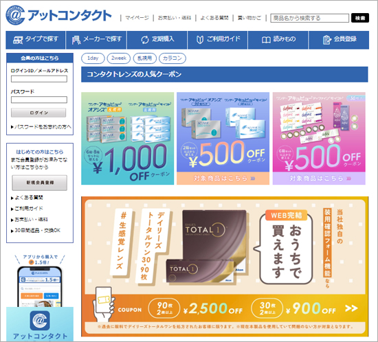 公式サイトでは、ワンデー、2ウィーク、1か月タイプなど用途別に商品検索が可能で、国内主要メーカー製品を中心に販売している。]では、ワンデー、2ウィーク、1か月タイプなど用途別に商品検索が可能で、国内主要メーカー製品を中心に販売している。